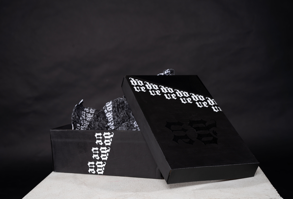I created a new logo composition using a gothic font and created a slanted formation which I used as a repeated pattern for my branding. I wanted to emphasize the sleek and expensive nature of my rebranded packaging, hence the glossy black on matte black dynamic.